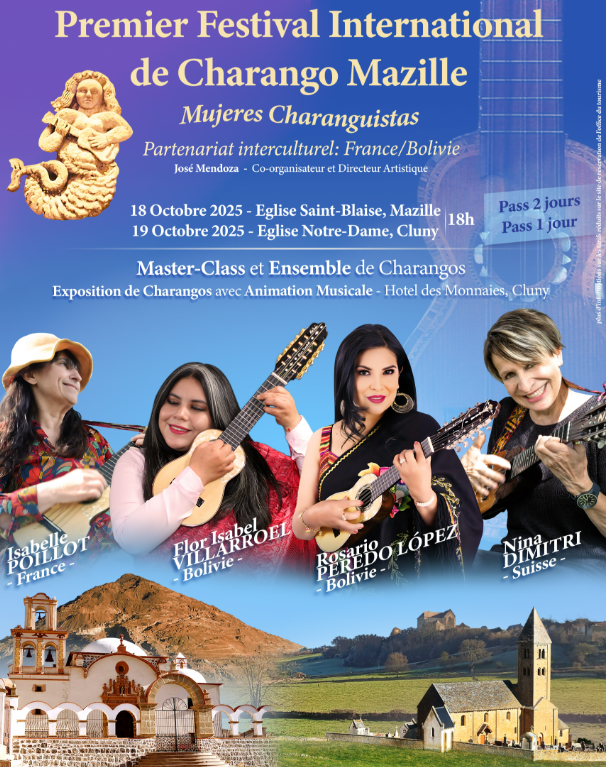Festival International de Charango Ayant pour thème. Mujeres Charanguistas. Pass permettant de visiter l’exposition de charango à l’hôtel des monnaies de Cluny 71, Assister aux Master Class et répétitions publiques à l’école de musique de Cluny 71
