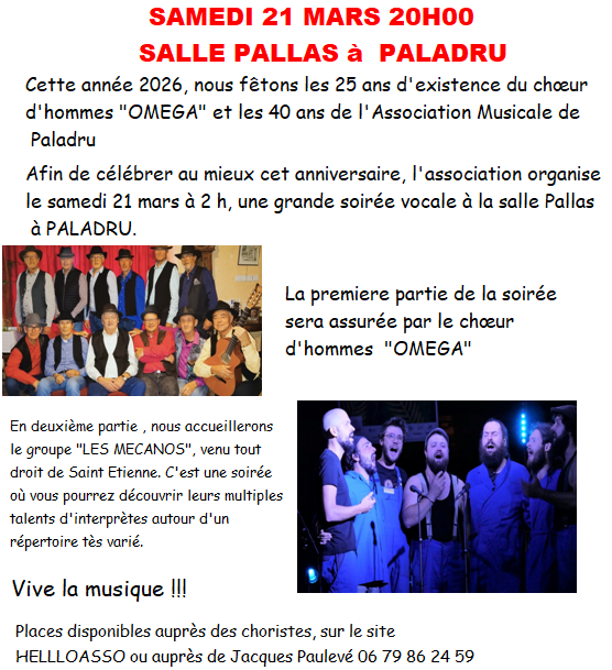 Afin de fêter les 40 ans de l’association et les 25 ans du cheur d’hommes « Oméga », nous vous proposons une soirée vocale le samedi 21 mars à la salle Pallas à Paladru (38), En deuxième partie nous accueillerons le groupe « Les Mécanos », venu tout droit de Saint Etienne.