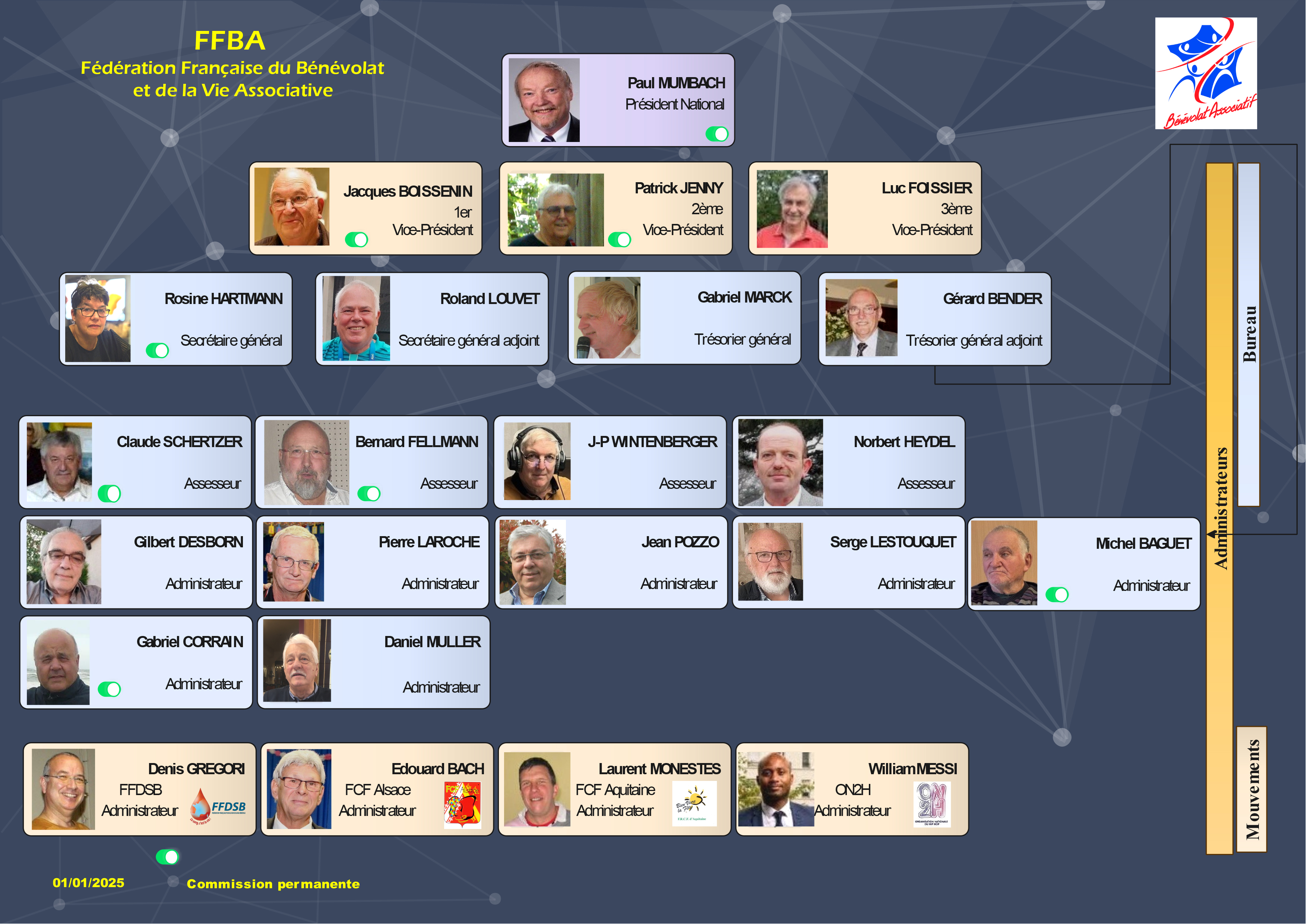 Les dirigeants de la FFBA sont déjà responsables d’associations de base. Ils y occupent des fonctions diverses (présidents, secrétaires, etc.).